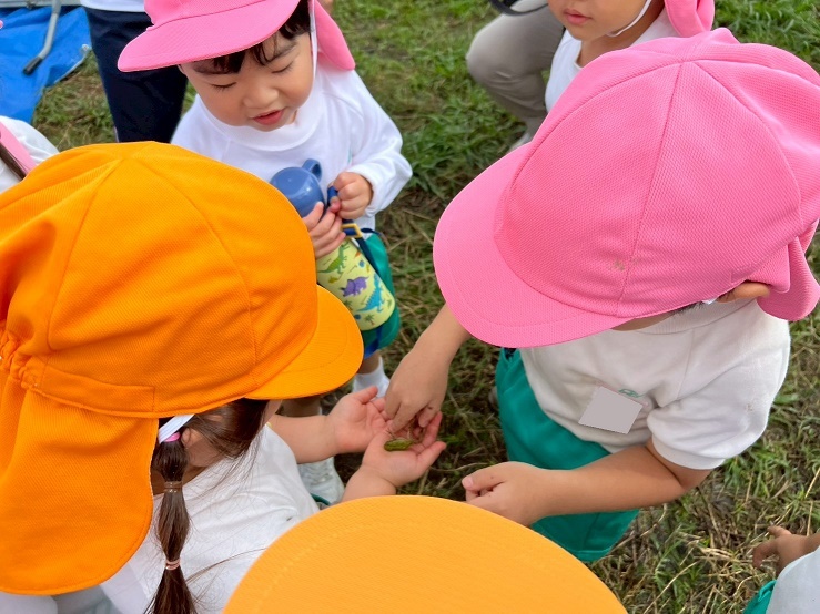 朝方まで降っていた雨の影響で、残念ながら、遊んだりおにぎりを食べたりすることはできませんでしたが、道中でカエルやコオロギを発見☆