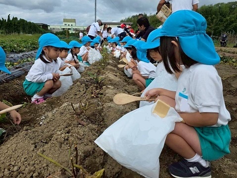 不安定なお天気の中となりましたが、行きのバスの中で「雨がやみますように!」「大きいおいもが掘れますように!」とお祈りしながら向かいました。