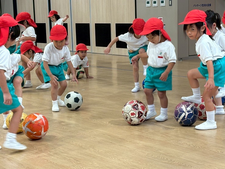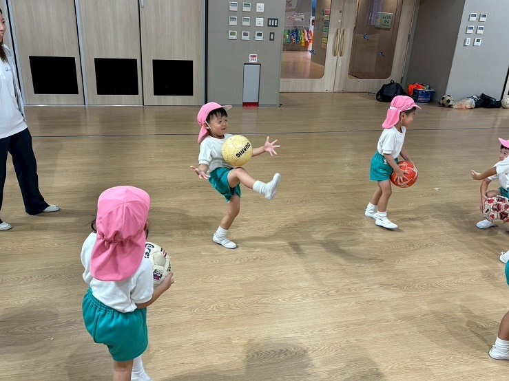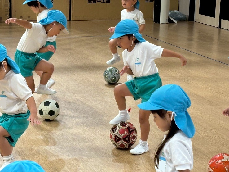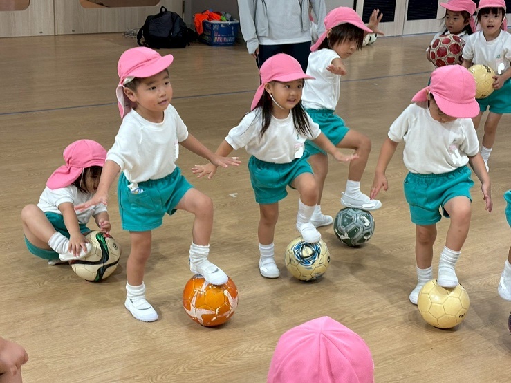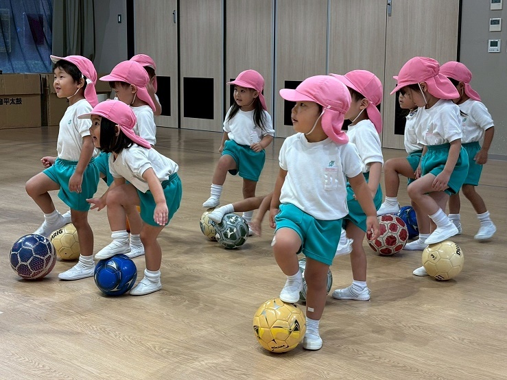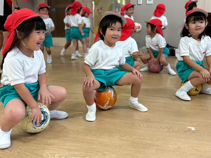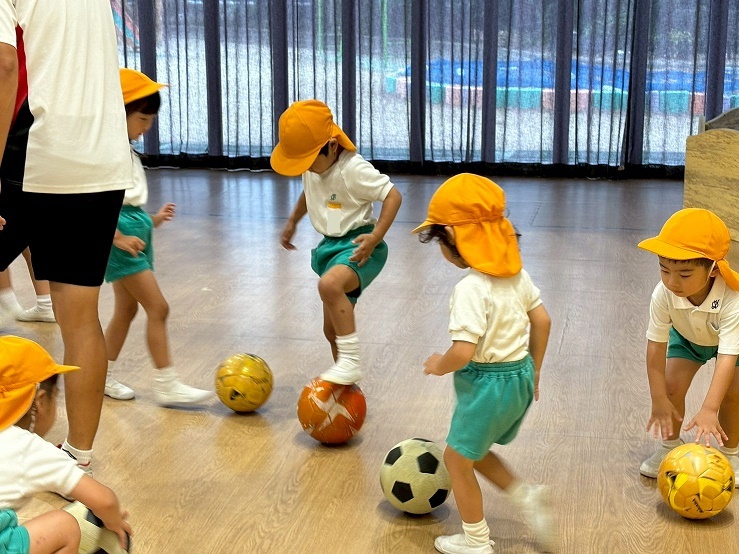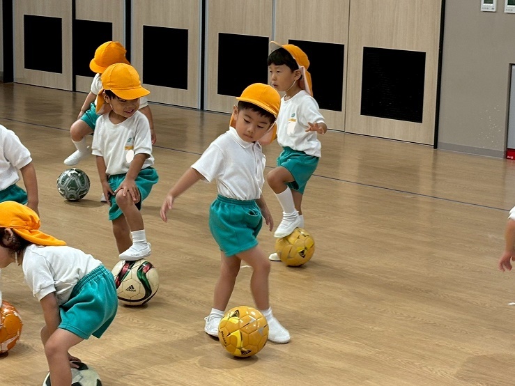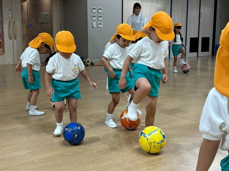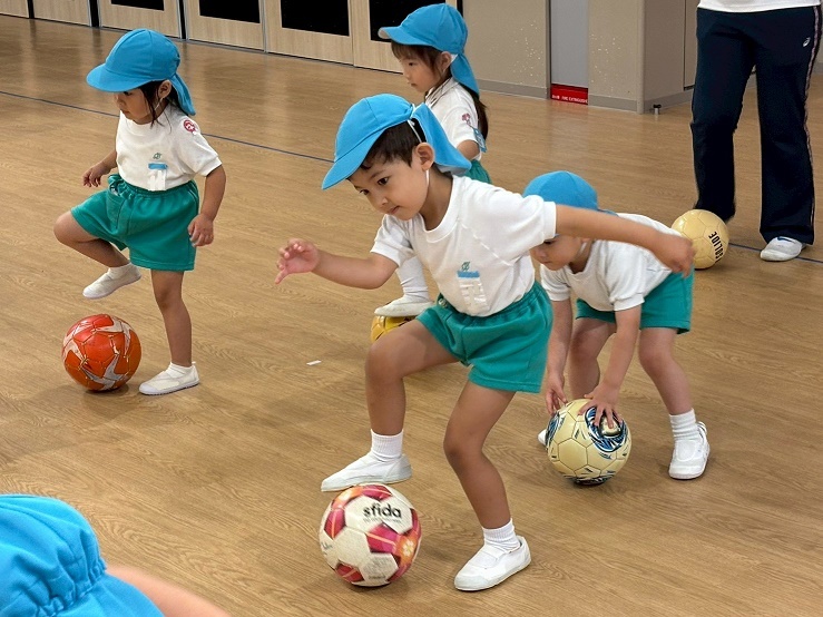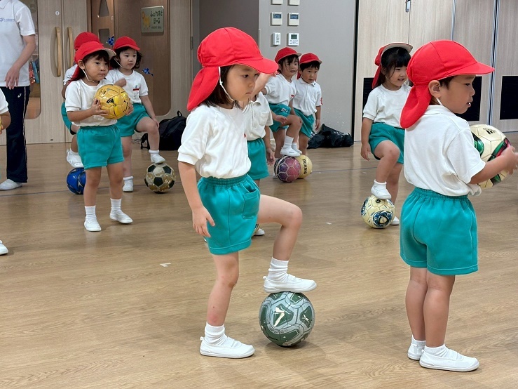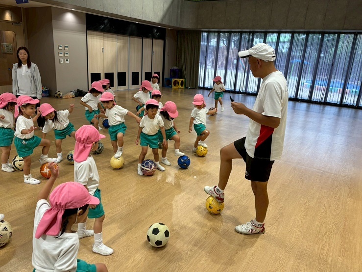コーチのとっても楽しいサッカー教室に、年少組の子どもたちは声をあげて笑いながら楽しんでいましたよ!