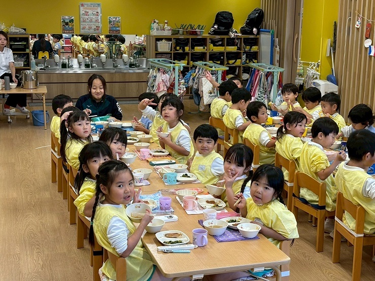 幼稚園に戻ったらホールに集まり、楽しい楽しいおにぎりタイム🍙