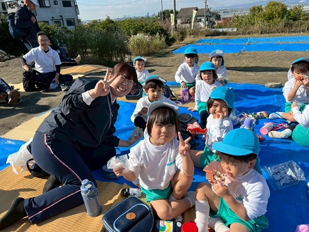 『おいしいね~』『ウインナーはいってるねん』とおにぎりをほおばってみんなニコニコ顔です。