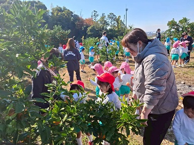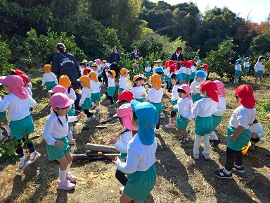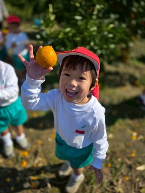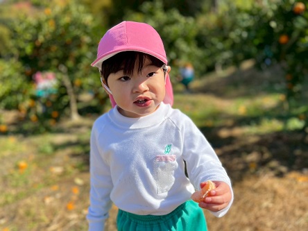 11月13日 朝から小雨が降っていて『行けるかな~』とちょっぴり心配していた年中組の子どもたち。出発する頃にはすっかり雨は上がり、予定通り交野金沢農園へみかん狩り遠足に行ってきました!