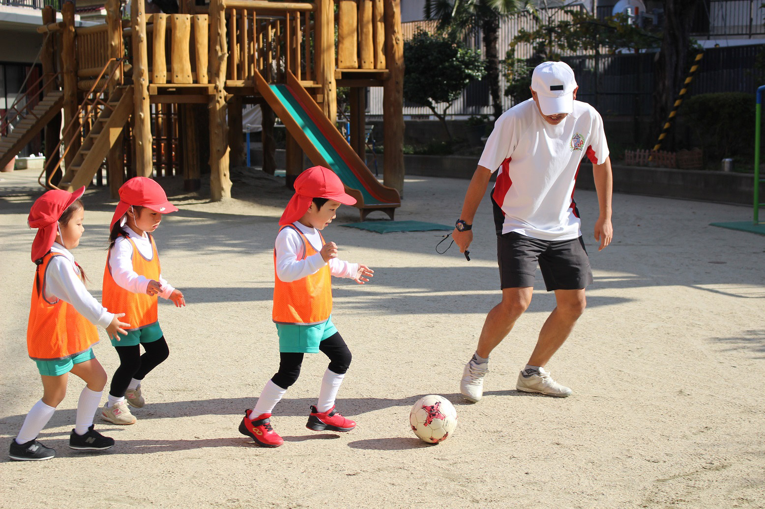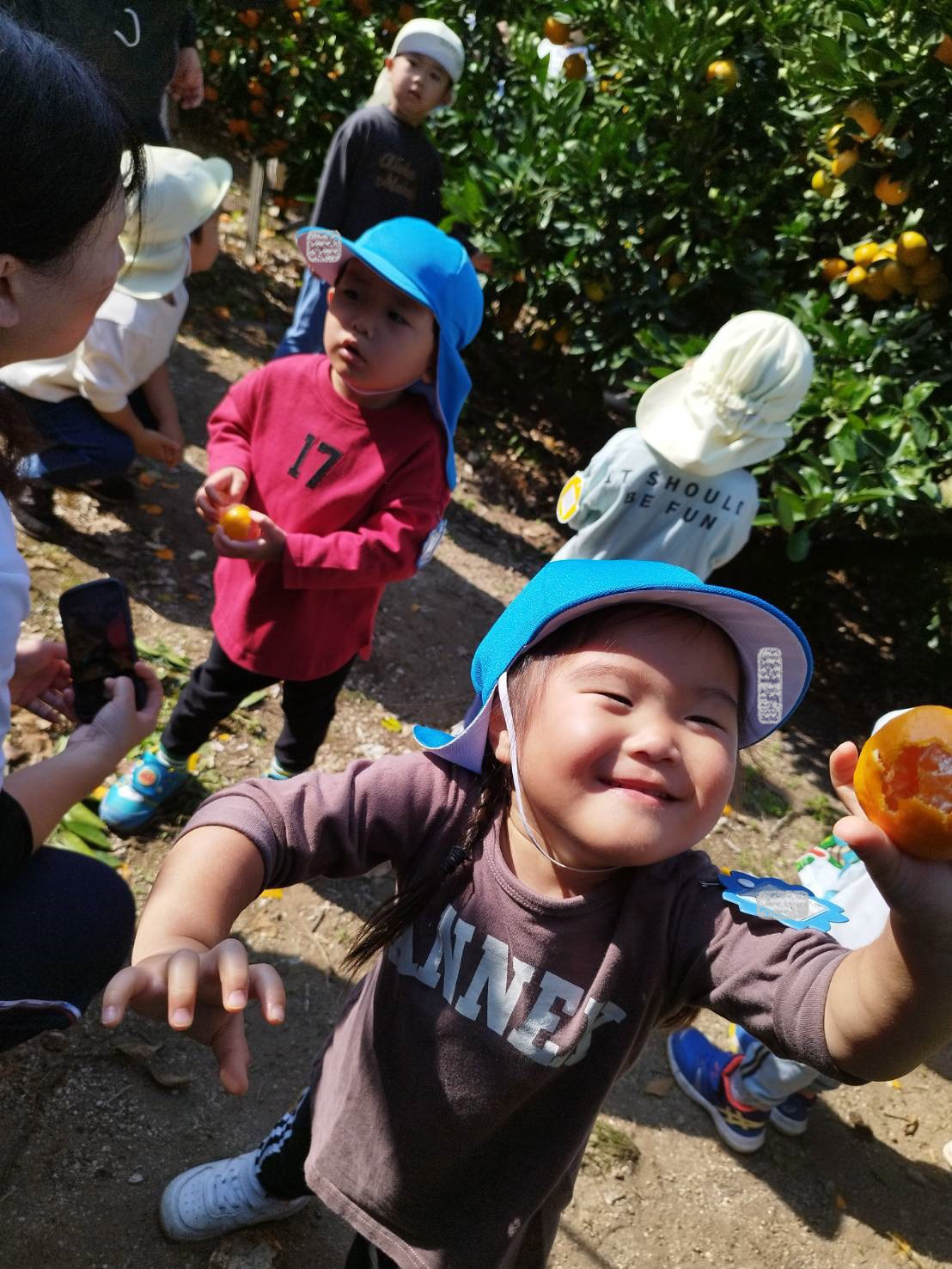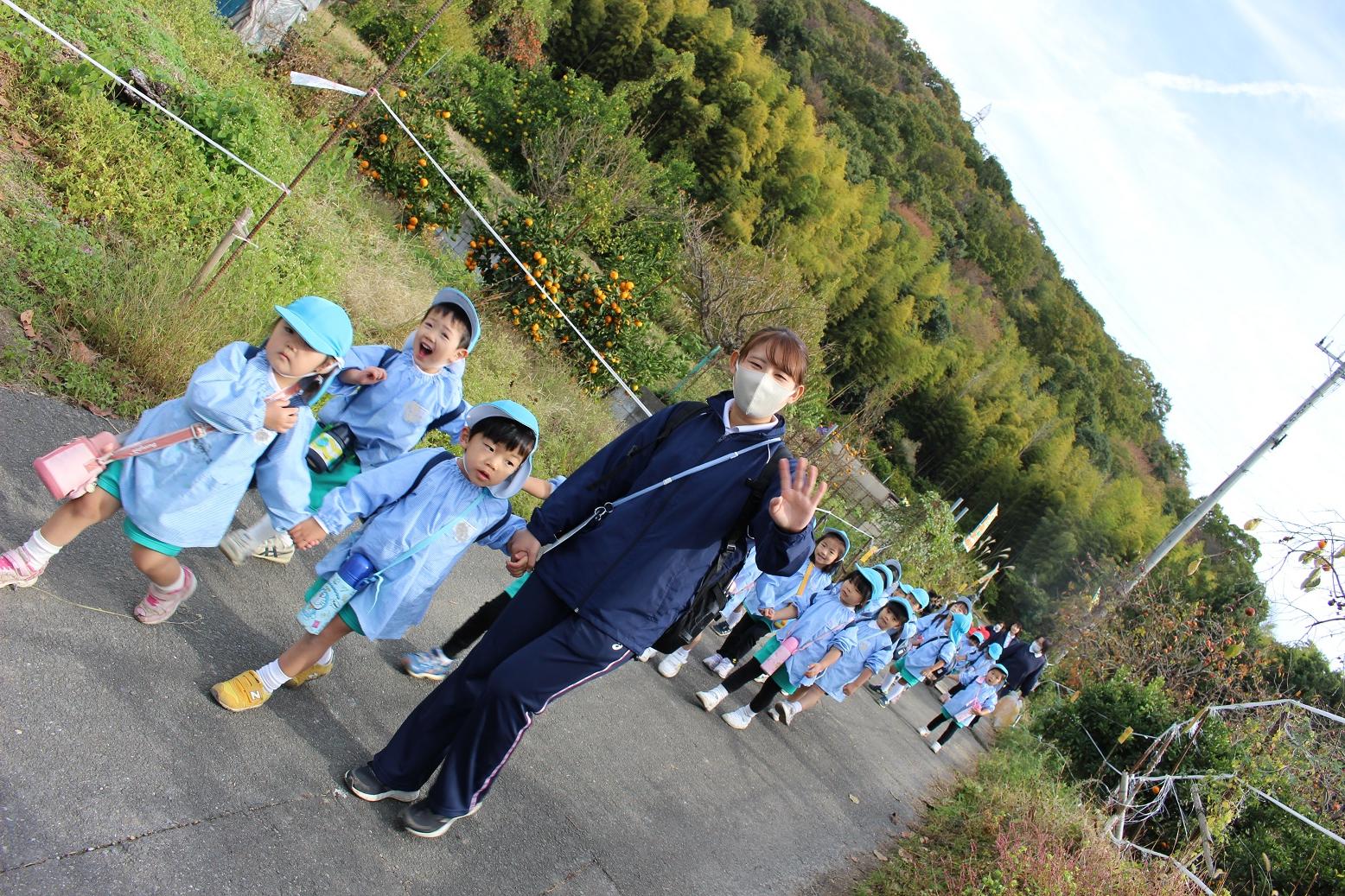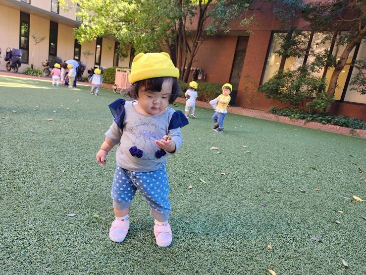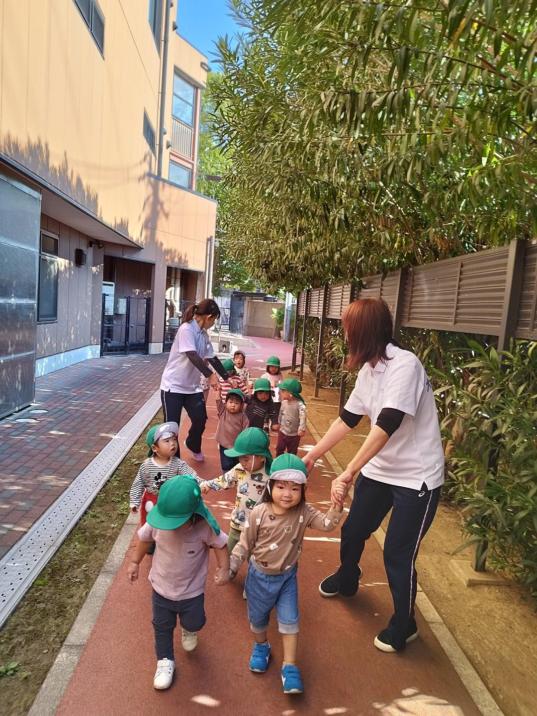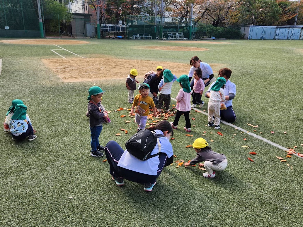 大学グラウンドへお散歩♪いろいろな色や形の葉っぱを嬉しそうにひろう子どもたちでした。"よいしょ よいしょ"と保育者と一緒に、散歩車を押してくれてありがとう♡
