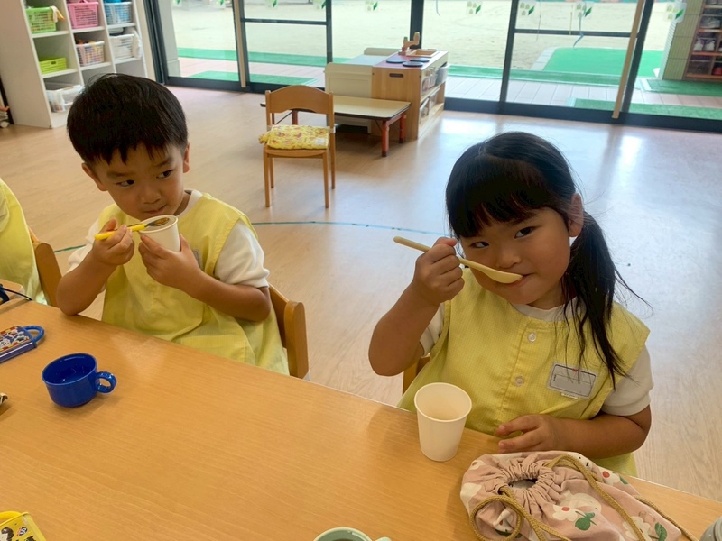 おにぎりのラップの絵をを見せ合ったり中身を言い合ったりしながら、美味しくいただきました。